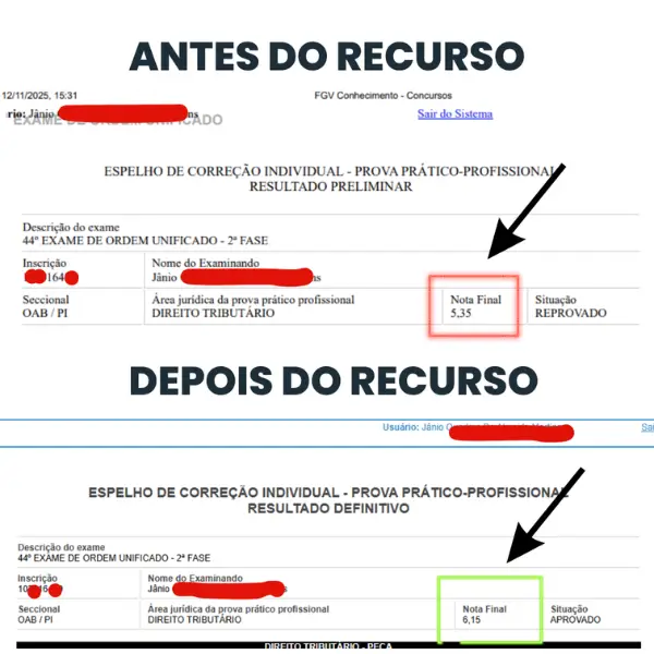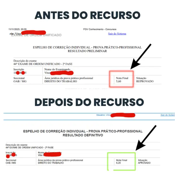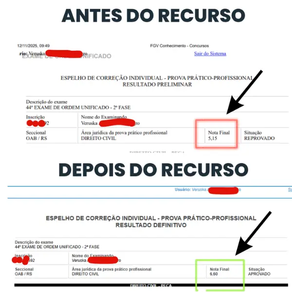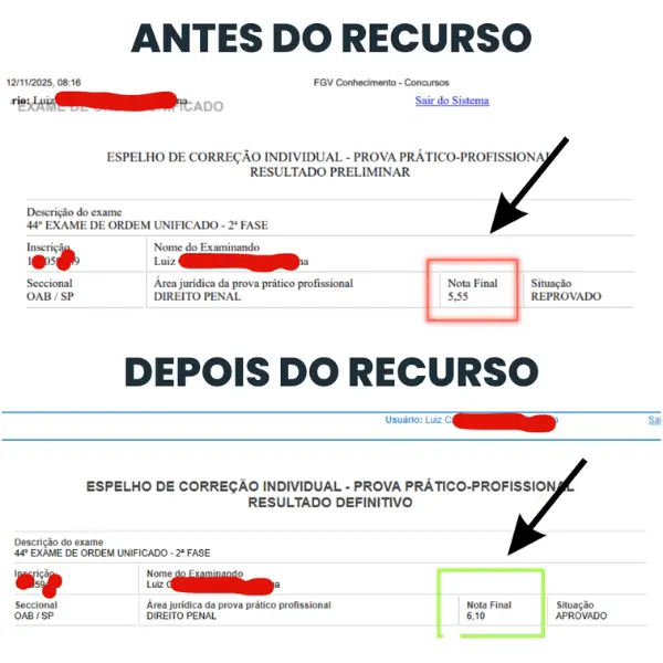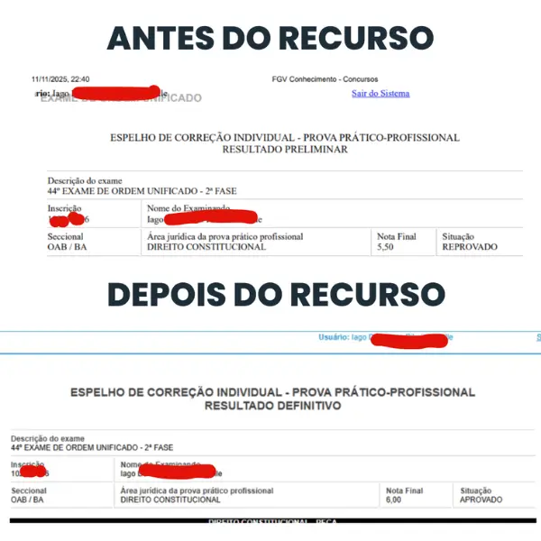 Na edição passada, o 44º Exame de Ordem, nossos professores conseguiram 43% de êxito nos recursos interpostos. Isso quer dizer que 1 em cada 3 recursos reverteram uma reprovação na 2ª Fase da OAB. Esse trabalho continuará nessa edição. Caso você tenha amargado um revés e esteja muito abalado(a) psicologicamente com o resultado ou deseja a ajuda de um dos nossos professores para elaborar seu recurso, não perca mais tempo!